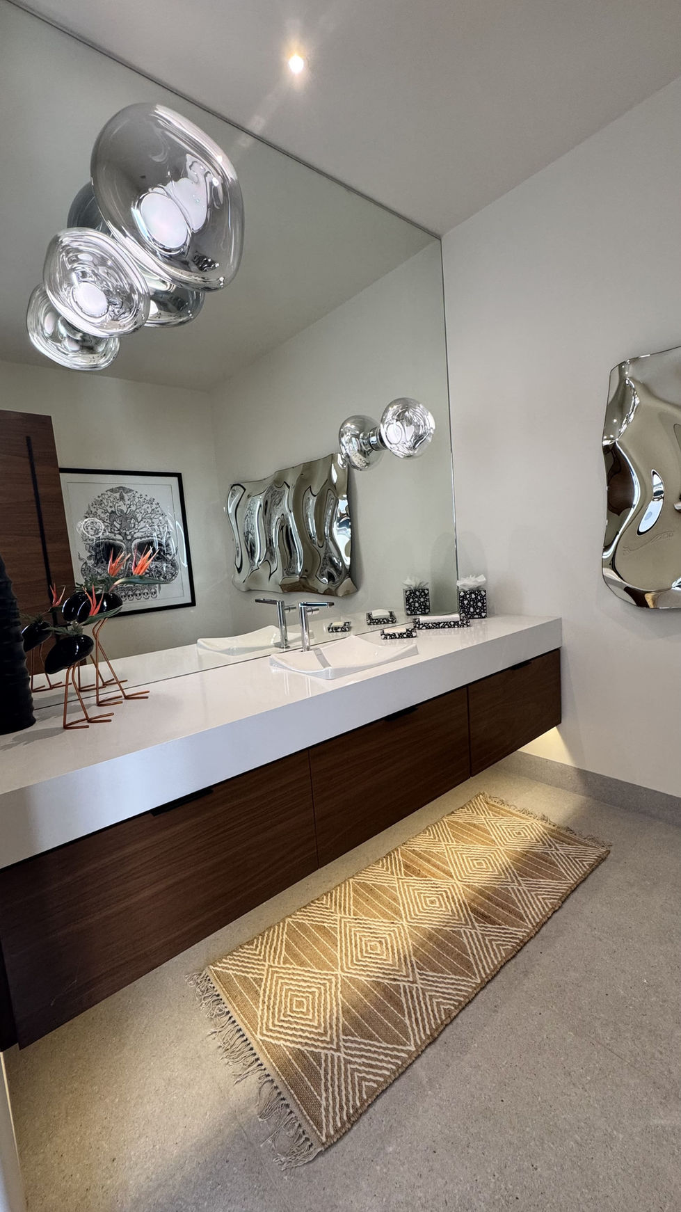 Custom millwork, sculptural lighting, and thoughtfully curated furnishings elevate each space with intention and balance. From the spa-like bath overlooking a private courtyard to the open living areas that extend toward the infinity pool and covered terrace, the design embraces contemporary coastal living with quiet luxury. Every element was carefully considered to create a serene, modern sanctuary designed for both intimate retreat and gracious entertaining.